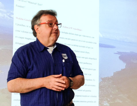 Wie macht man gute Ausstellungstexte? Redaktionsleiter Martin Baur, Südkurier Überlingen, informiert die Studierenden mit Praxiswissen. 27.5.2015.
