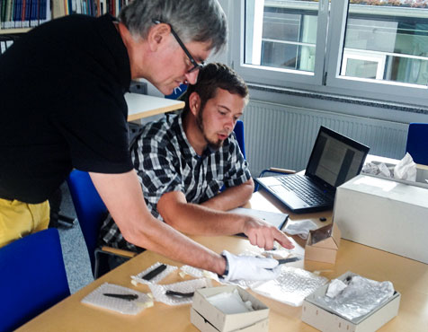 Die Fundauswahl erreicht den Bearbeiter. Prüfung der Vollständigkeit und Unversehrtheit der Stücke anhand des Restauratorenberichtes. Juli 2015.