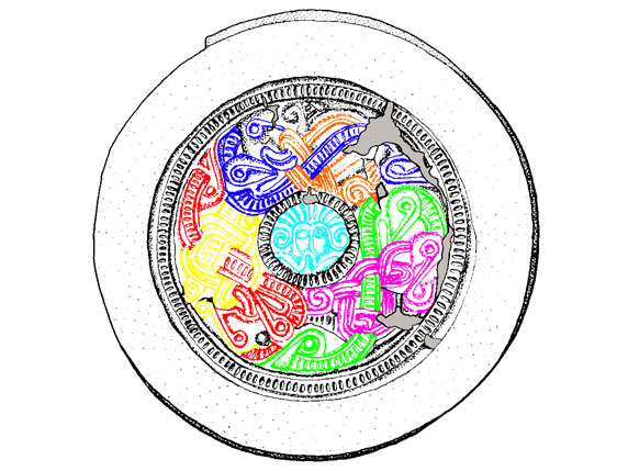 Im Zentrum des Hauptfeldes ist ein menschliches Gesicht zu sehen, das von einem Kreisband umgeben ist. Das Zentrum umgebende Feld ist mit stark stilisierten, bandförmigen, tierartigen Figuren ausgefüllt, die wiederholt ineinander verschlungen sind. Sie sind im Profil dargestellt und befinden sich in gleicher Ausrichtung zueinander. Die bandförmigen Körper sind jeweils S-förmig gewunden und wie die Kreisbänder ausgeführt. Im Anfangs- und Endbereich sind stark stilisierte Vorder- und Hinterläufe erkennbar. Die Köpfe sind zum Außenrand der Scheibe hin orientiert und blicken nach rechts auf die eigenen Körper. Die Köpfe und Beine sind stilistisch uneinheitlich. Auffällig ist dass das Zentrum der Oberarm- bzw. Oberschenkelbereiche mit einem Kreis bzw. Punkt gefüllt ist. Um jede dieser drei Figuren windet sich jeweils eine weitere Tierfigur in Seitenansicht. Ihr Körper besteht aus Bandmustern, die sich aus zwei bis drei parallelen Linien zusammensetzen. Sie bilden damit einen Kontrast zu dem leiterartigen Bandmuster der S-förmigen Tiere. Sie sind mehrfach selbst ineinander verschlungen und umwinden die S-förmigen Tiere im mittleren Bereich ihrer Körper. Die Umwindung ist auch hier mehrfach und eng. Diese Figuren wirken weniger symmetrisch und verteilen nicht so weit über die jeweilige Fläche. Während die S-förmigen Tiere kompositorisch im Vordergrund zu stehen scheinen, treten die anderen eher „knäuelförmigen” Tierfiguren in den Hintergrund. Eine Artzuweisung der Tiere ist nicht möglich.
